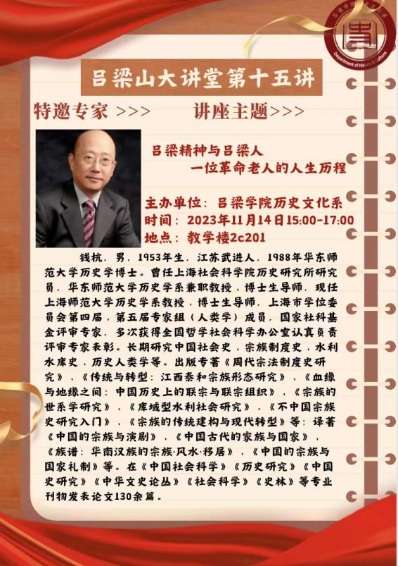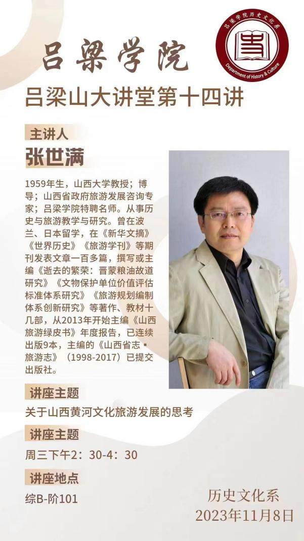 2023年11月,必威西汉姆联特邀请山西大学教授张世满、上海师范大学教授钱杭、山西大学教授张俊峰到校,开展了“吕梁山大讲堂”三场专题讲座。张世满教授《关于山西黄河文化旅游发展的思考》分别从黄河及黄河文明概要、关于山西黄河文化的内涵、山西黄河文化旅游资源及其开发现状、山西旅游黄河板块的提出及其发展思路四个方面展开,为山西黄河文化旅游的发展提出构想与建议。钱杭教授《吕梁精神与吕梁人——一位革命老人的人生历程》讲述了一位吕梁籍南下干部的革命历史,感人泪下,并以一位历史学者的身份用各种资料证实、补充前人革命回忆,在娓娓道来中授听讲者以渔。张俊峰教授《谱写抗日战争研究的协奏曲——基于区域抗战史研究的思考》从历史地理和社会史相结合的角度提出了对区域概念的丰富理解,以红军东征、晋西事变等山西抗战重要事件为例,引导大家深入解读抗战史研究中的区域属性,将相关研究深挖拓展。