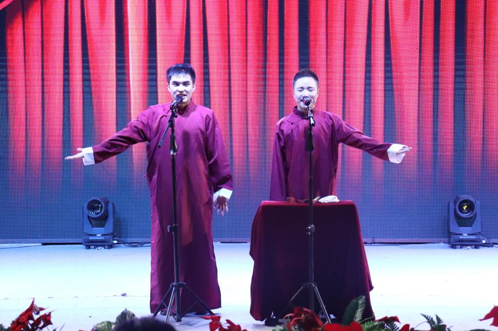 在互动环节中,主持人抽选了几位毕业生观众,同学们在发言中表达了对老师的辛苦栽培的感恩和对即将离开校园的不舍,谈论起自己喜欢的老师时同学们争相模仿起来,惟妙惟肖的模仿逗笑了在场的每一位师生。在互动环节结束后,一支气势磅礴的舞蹈《黄河》又将同学们的思绪带回到晚会现场的表演中。当大家澎湃的心刚刚随着音乐的静止而稍稍落下时,相声《毕业了,结果呢》爆笑表演、嗨翻全场。健美操《青春悦动》带同学们领略了青春的活力与张扬,接下来的小品《老同学》、朗诵《毕业朗诵词》、合唱《强国一代有我在》和歌伴舞《那些花儿》让同学们重温了这四年校园生活的点点滴滴,同学们的精彩瞬间历历在目。