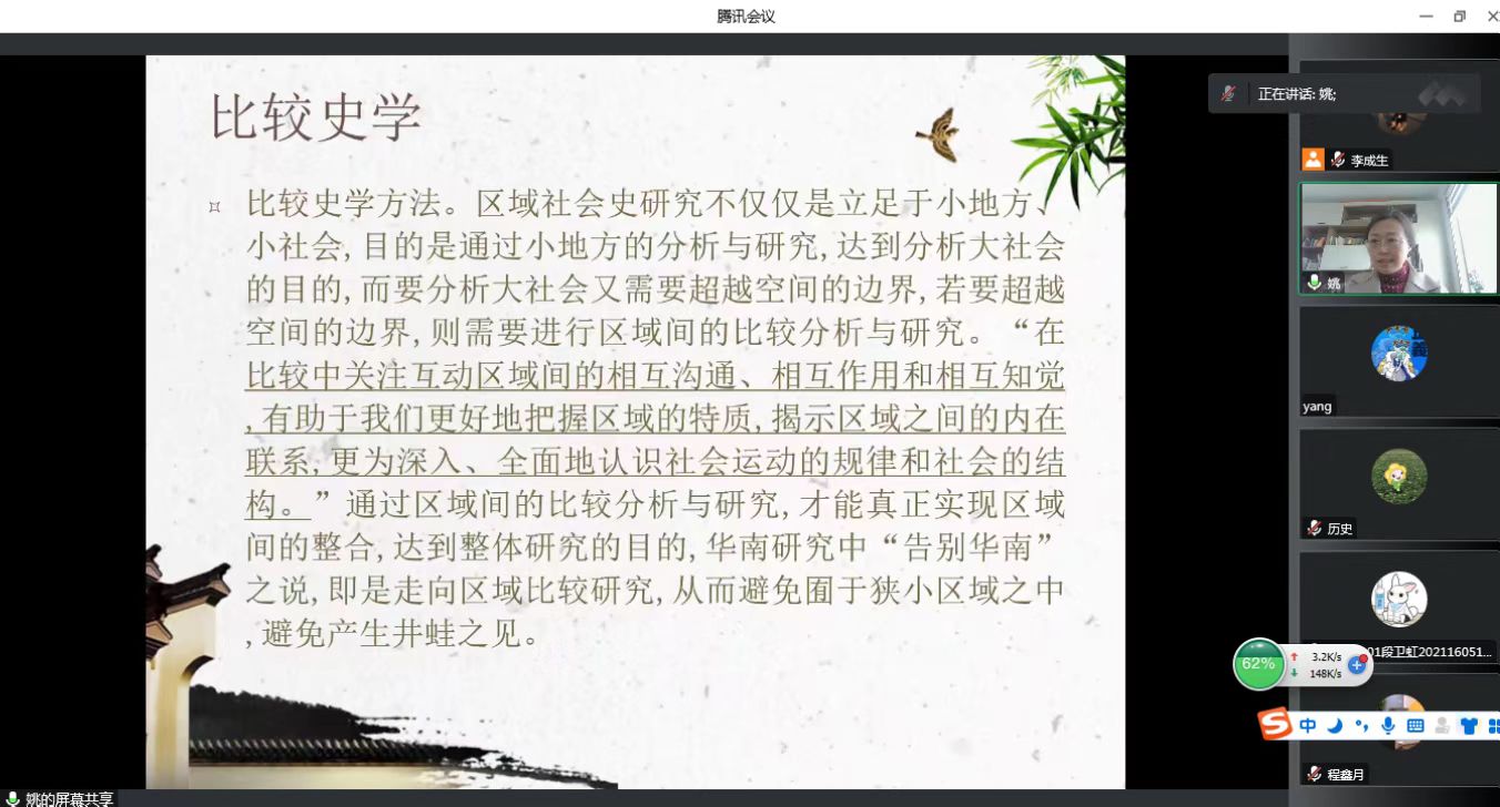20世纪80年代以来,区域社会史成为了中国社会史研究的新方向,出现了“华南学派”“华北学派”等学术群体,取得了巨大的成绩。姚春敏教授对区域社会史兴起的原因、研究特征、主要成果和代表人物做了详细介绍。